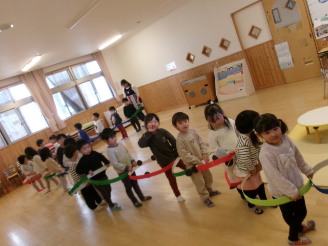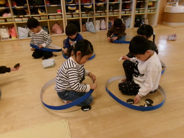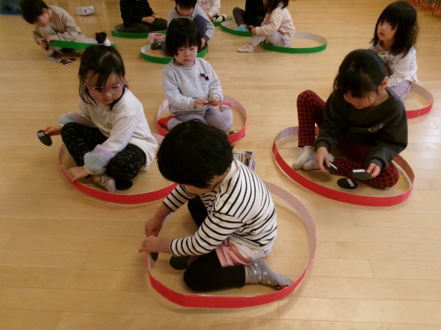 お家の方と乗る電車を作りました。色を決めたり、タイヤを付けたりと期待を持っていた子どもたちです。親子レクレーションでは、じゃんけん列車のルールを理解しながら、楽しむことが出来ました。