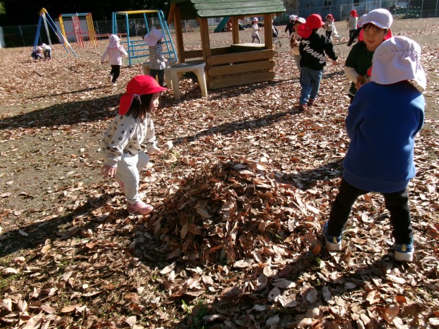 グラウンドで、だまさんがころんだや、かくれんぼ、落ち葉を集めてお山作りをしました。かくれんぼでは、隠れ方のポイントを伝えると、ひそひそ話で隠れる場所を決めていました。