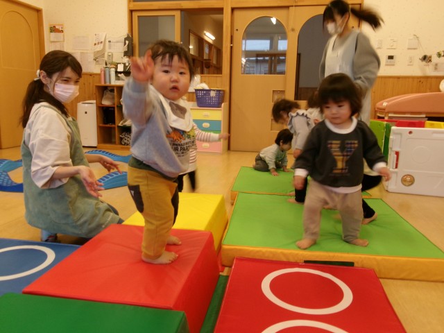 友だちと遊ぶが♪良い刺激となり、共通の遊びから真似したり、興味を持ったりと保育者との一対一の関わりから、友達と一緒に遊ぶがとても楽しそうです。声を出し合い笑う姿を見るとほっこり心が温まります。