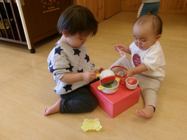 お外でもお部屋でままごと等ごっこ遊びが行えるようになってきたもも組です。容器に砂や食材に見立てた物を入れて混ぜたりコロコロ転がしたり料理姿が様になってきました。
