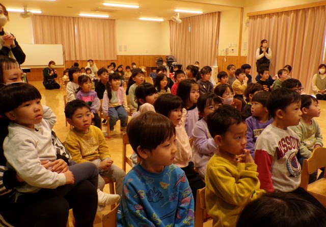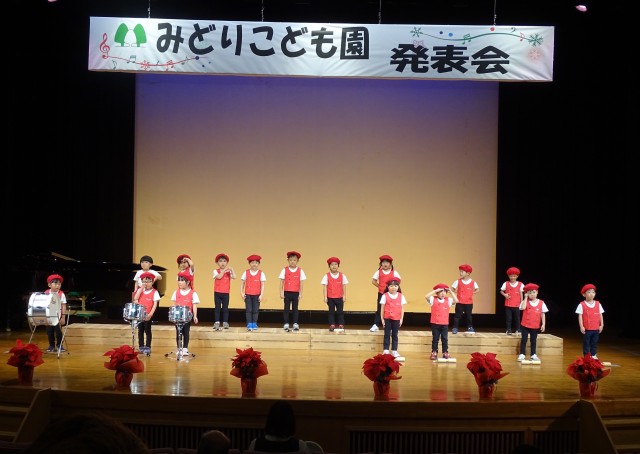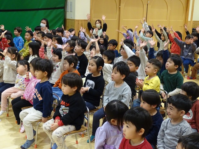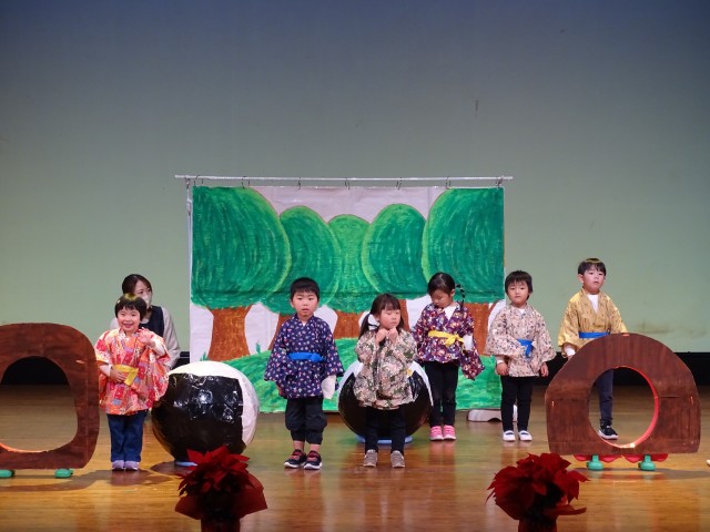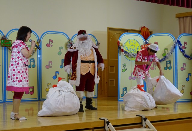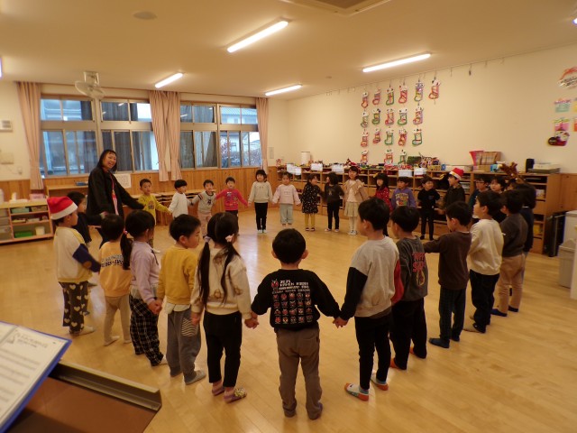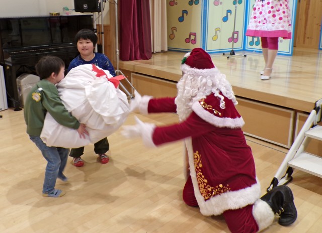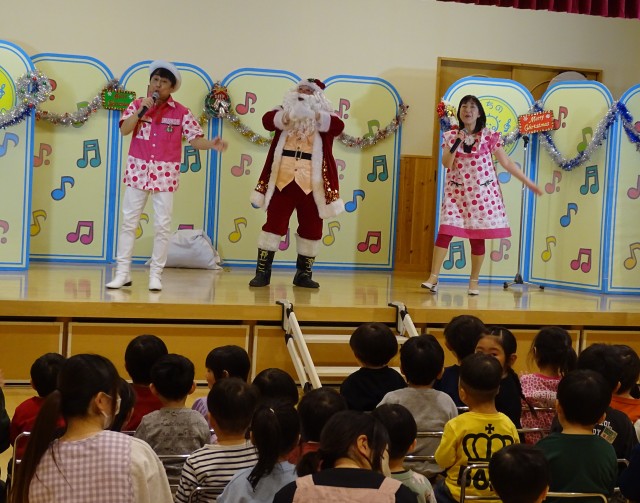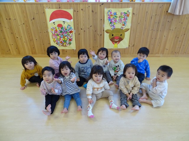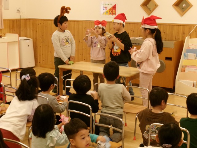 毎日、元気いっぱいに過ごしている子どもたちへのクリスマスプレゼント。『まちのおんがくやさん』を迎えてクリスマスコンサートを行いました。『ひいらぎかざろう』から始まったコンサートは、途中でサンタクロースも登場して、歌ったり、体を動かしたりと、大盛り上がりとなりました。サンタクロースが届けてくれた、お家の方の手作り長ぐつのプレゼントも、とっても喜んでいた子どもたちです。