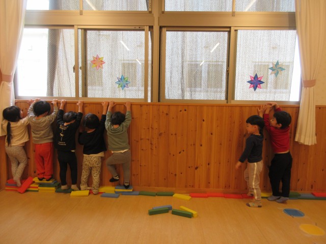 保育参観で運動会ごっこを行いました。大好きなお家の方を目の前にし、嬉しさと恥ずかしさとでちょっぴり戸惑う子もいました。『よーいどん!』の合図で担任のもとまで元気いっぱい走り、親子では『お引っ越しゲーム』を楽しみました。お子様の成長を感じるひとときになっていたら、嬉しいです。