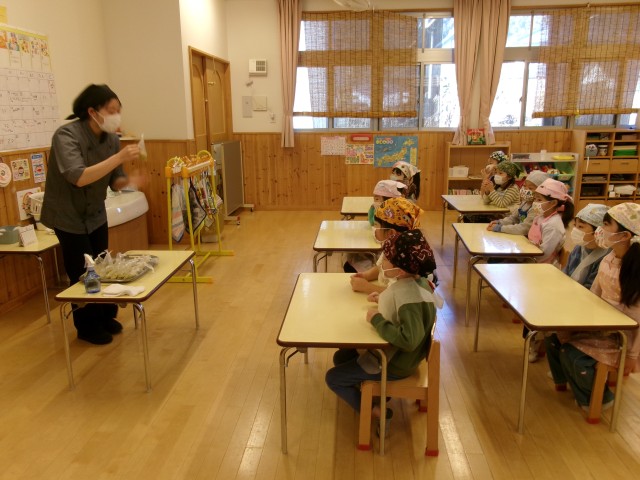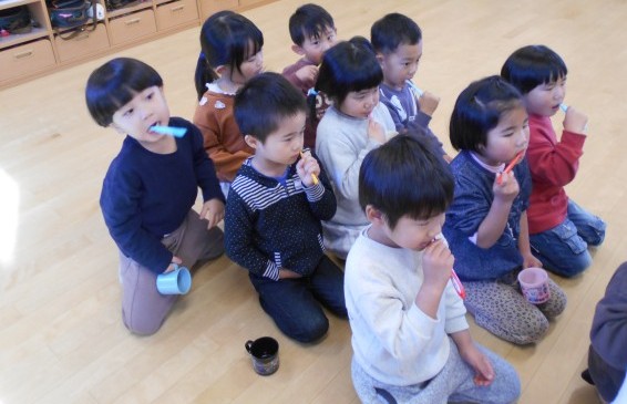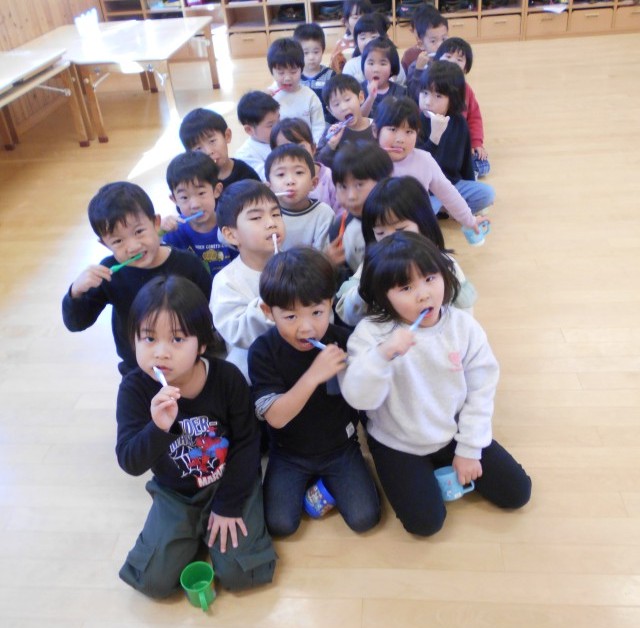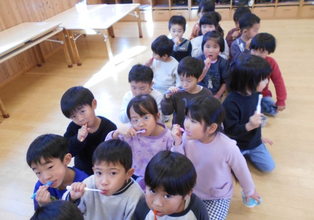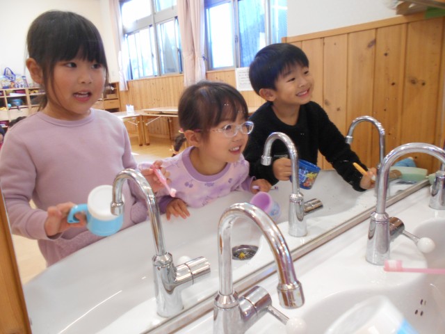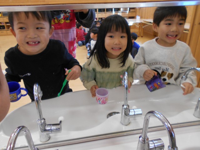 虫歯予防や口の中を清潔に保つ為、食後は歯磨きをしています。磨き終わった後はよくうがいをし、ピカピカになった歯を見て嬉しそうな子どもたちです。