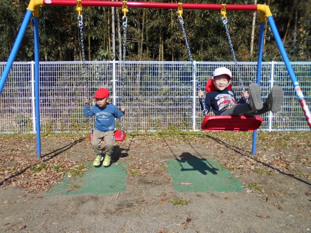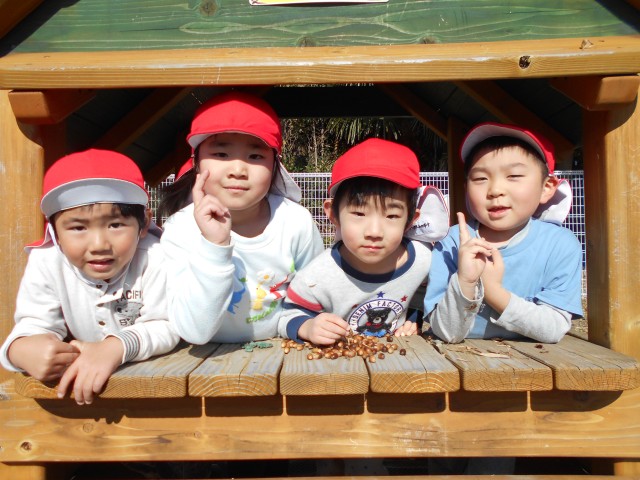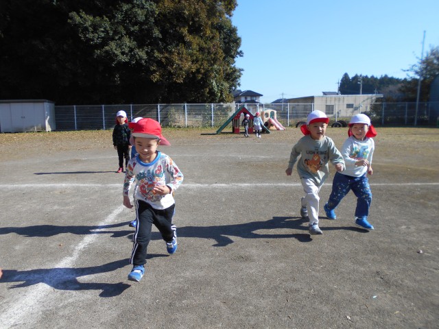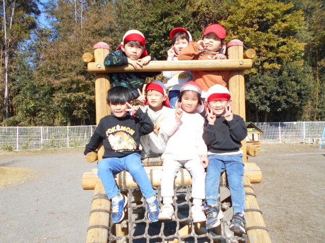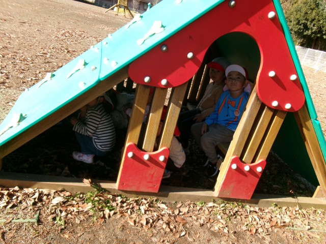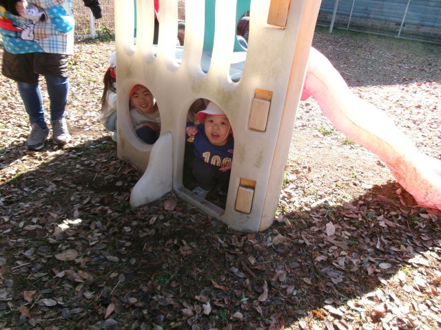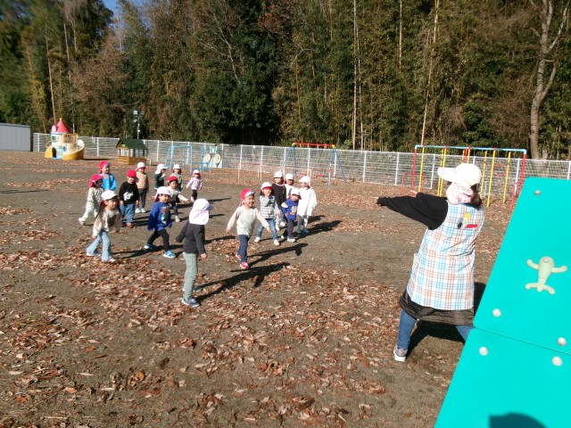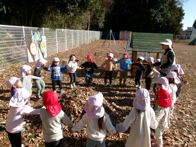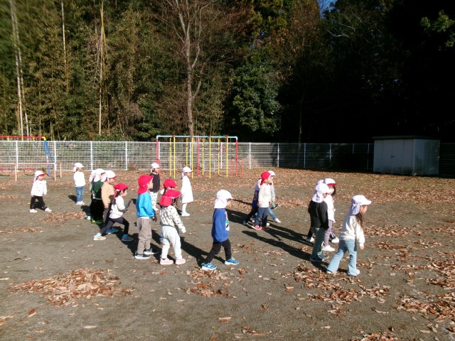 グラウンドで、だまさんがころんだや、かくれんぼ、落ち葉を集めてお山作りをしました。かくれんぼでは、隠れ方のポイントを伝えると、ひそひそ話で隠れる場所を決めていました。