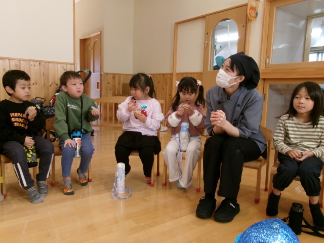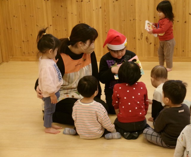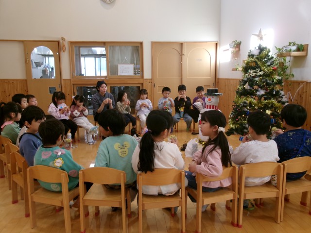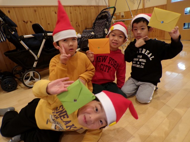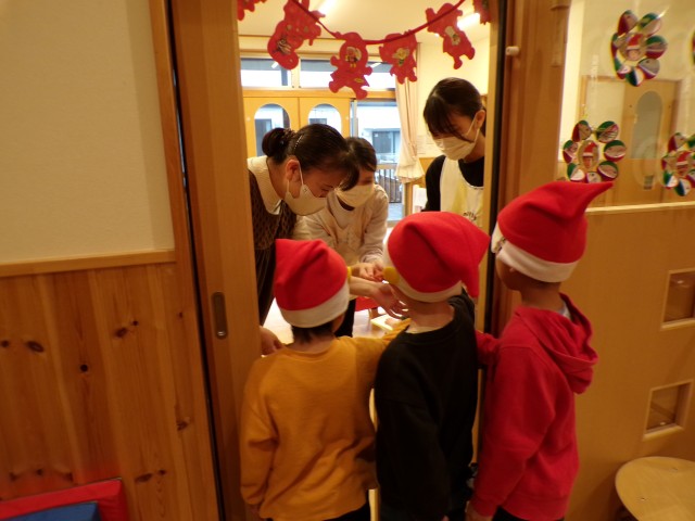 数日前から計画していたクリスマスパーティー(*^-^*)子どもたちがミニサンタに変身し、4名ずつ各クラスに手作りのプレゼントを届けに行きました。自己紹介をしたり歌を歌ったり、一緒に遊んで過ごしました。その後雪だるまを囲んでお手紙交換をしました。誰からのお手紙が届くかドキドキしていた子どもたちでした。先生方にもプレゼントを手渡し、楽しいパーティーとなりました(*^-^*)