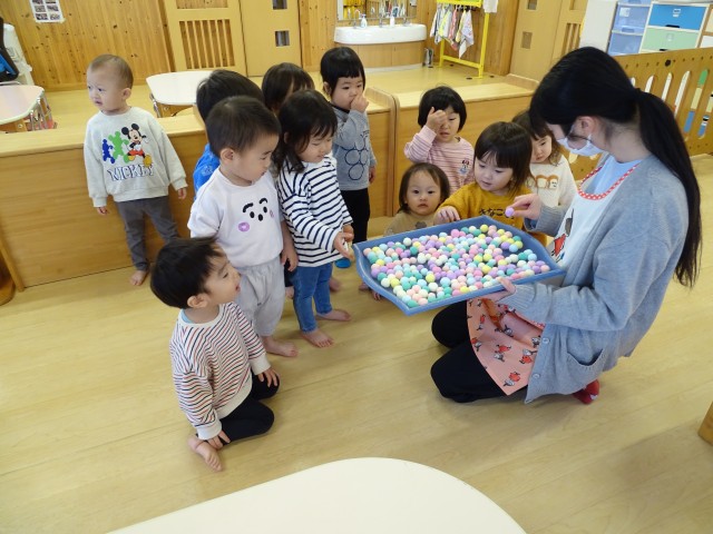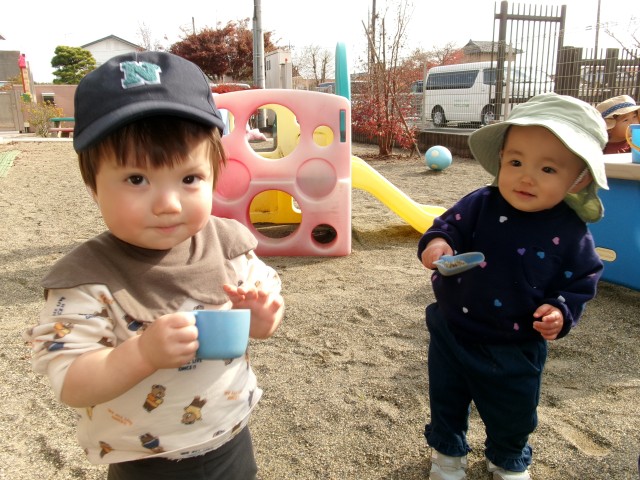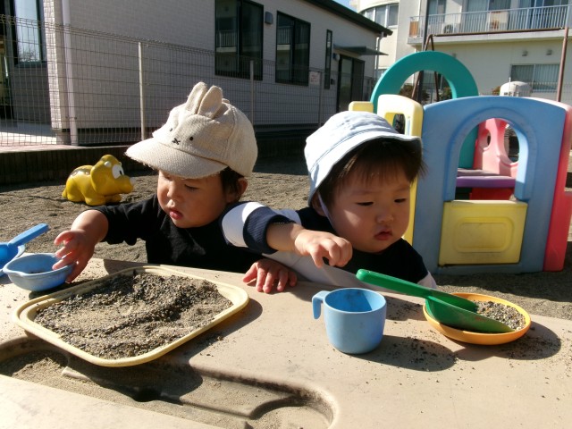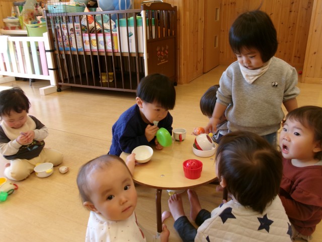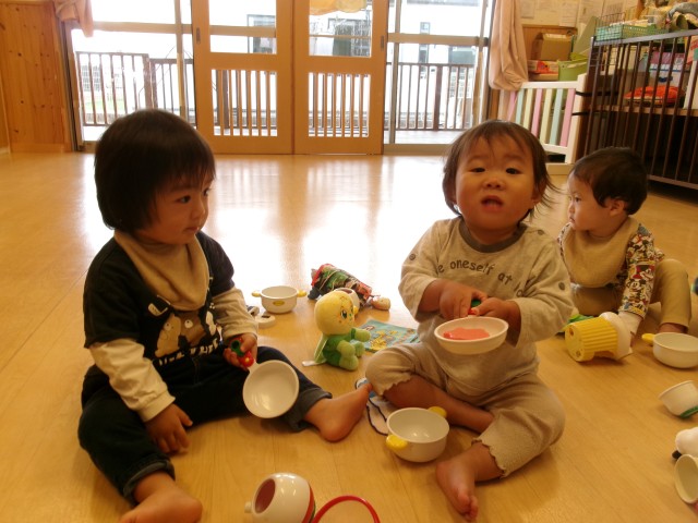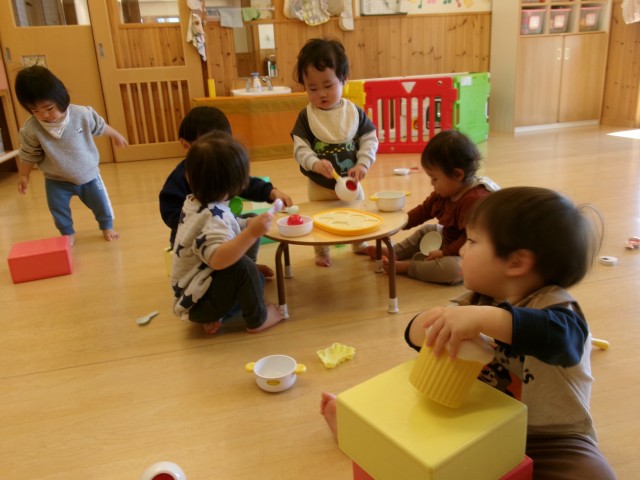 お外でもお部屋でままごと等ごっこ遊びが行えるようになってきたもも組です。容器に砂や食材に見立てた物を入れて混ぜたりコロコロ転がしたり料理姿が様になってきました。