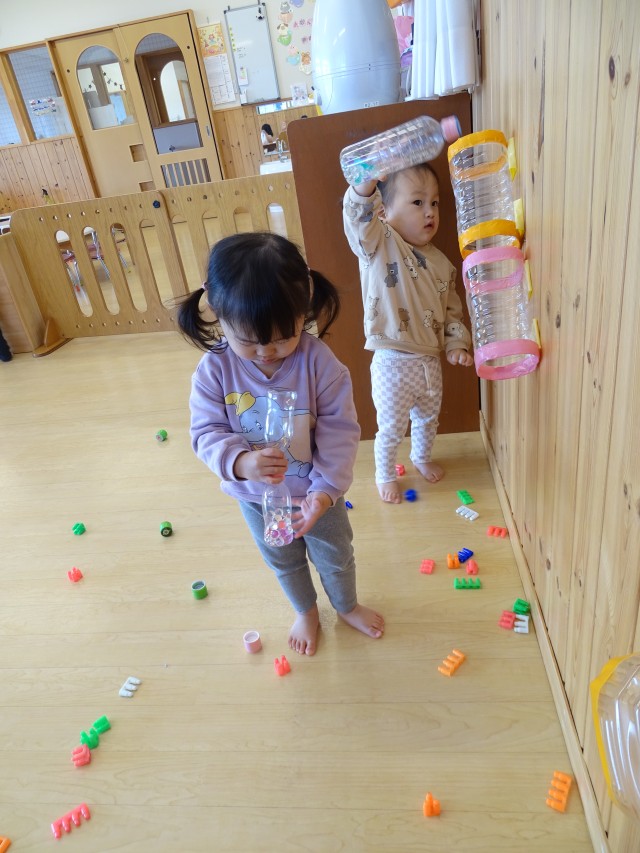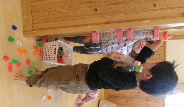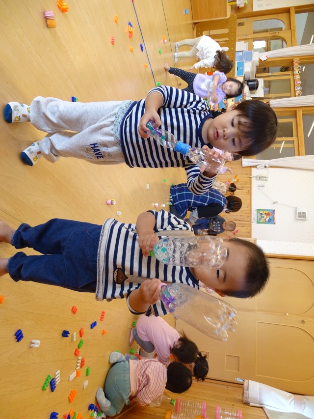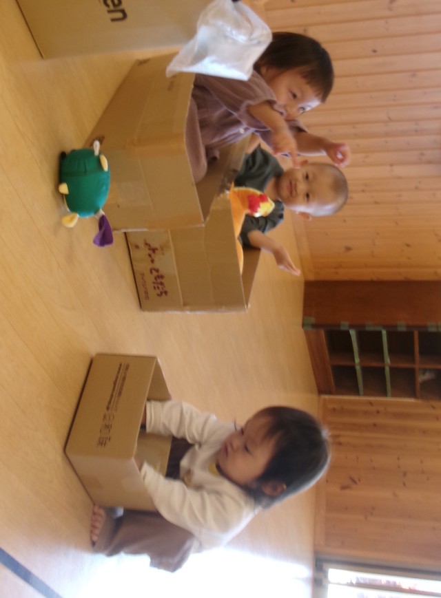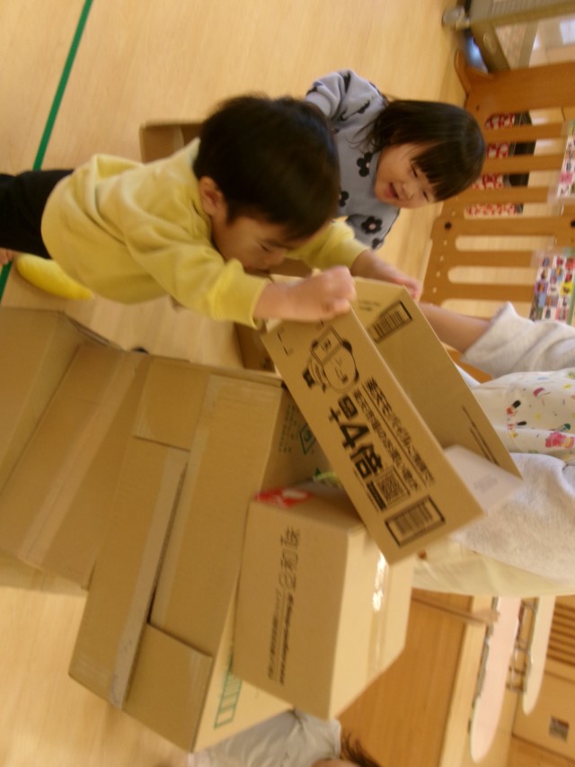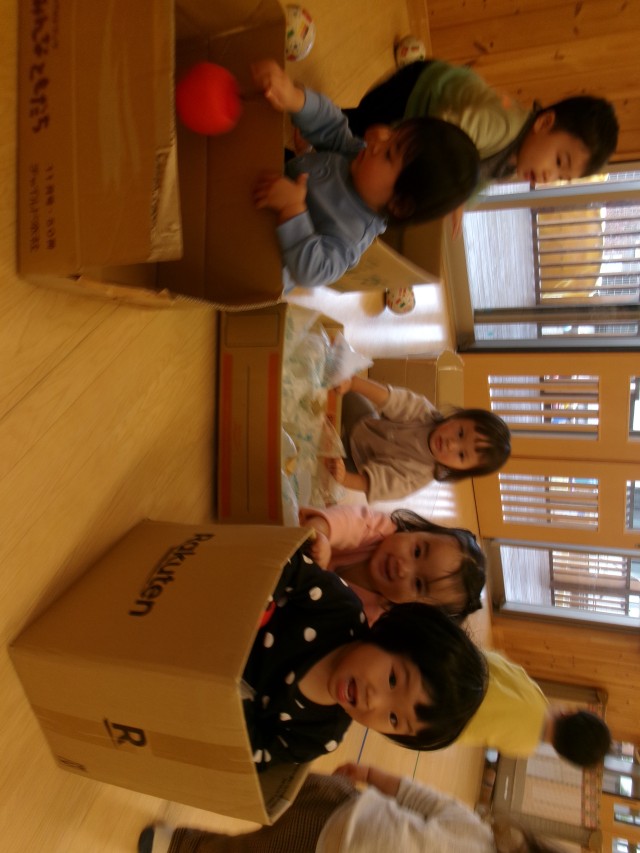 ダンボールでの自由遊びやペットボトルの手作りおもちゃあそびを行いました。どちらの遊びもよく考えながら、表情から「こうやってみようかな…」と心の声が聞こえてきそうな様子で遊びに没頭する子どもたちでした。