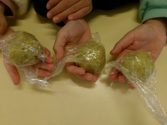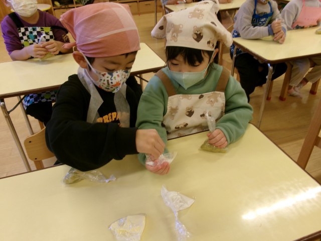 給食の先生の指導の下、さつまいも茶巾作りに挑戦した子どもたち(*^-^*)材料のさつまいも、バター、砂糖、生クリームが入った袋をこねこねよく混ぜ、丸く成型していきました。出来上がった茶巾はクリスマス―ツリーを囲んでみんなで食べました。「甘い!」「生クリームの味がする!」と感想を述べていた子どもたち。楽しいクッキングとなりました。