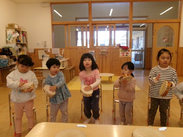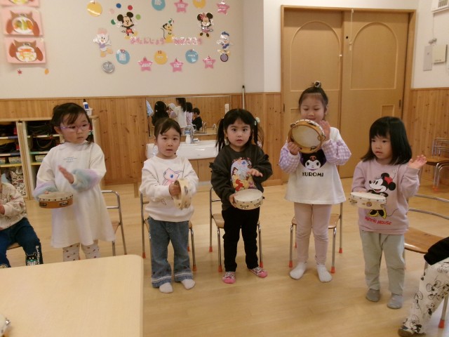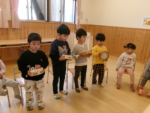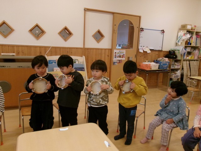 発表会の合奏を真似て、タンバリンを鳴らしながら歌を歌いました。みんなで音を出したり、止めたりする中で、表現を楽しみました。
