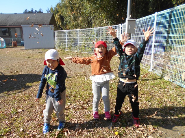 戸外でのびのび遊ぶ子どもたち!かけっこブームが続いていて、リレーや鬼ごっこを楽しんでいます。どんぐり屋さんを開いたり、落ち葉のシャワーで秋の自然を満喫していました。