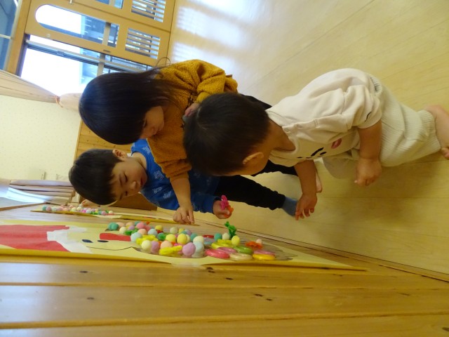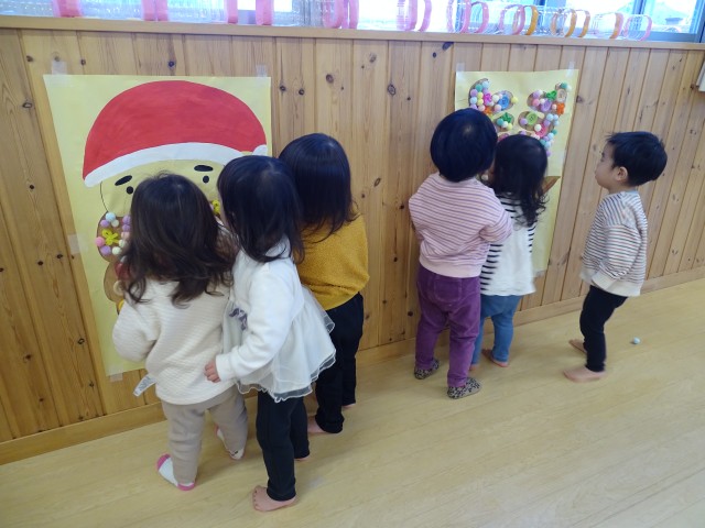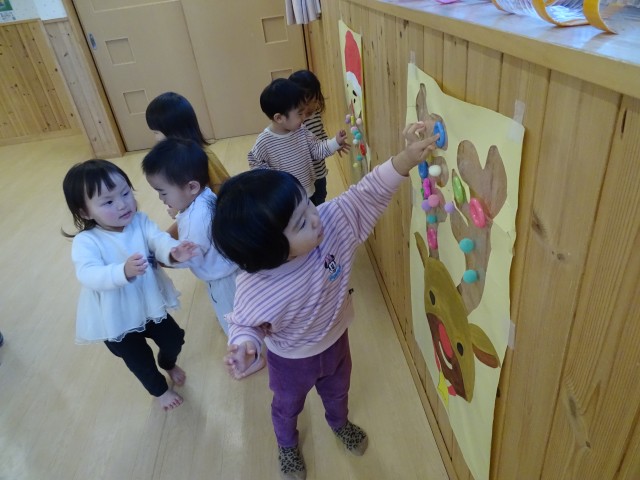サンタさんのおひげやトナカイさんのつのにポンポンボールやボタン、モールで作ったリボンを貼りました。お約束を守りながら、1つずつ「どれにしようかな?」と選ぶと好きな場所にペタリ。慎重にぴったり貼る子、どんどんスペースを埋めていく子、気に入った色や形にこだわりをみせる子など個性が出ていました。